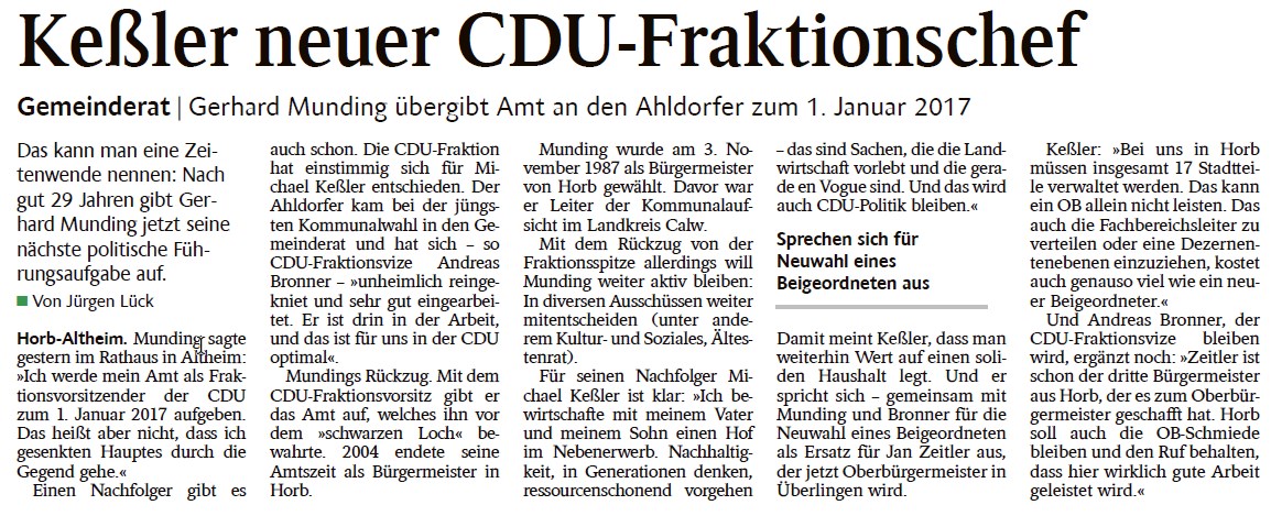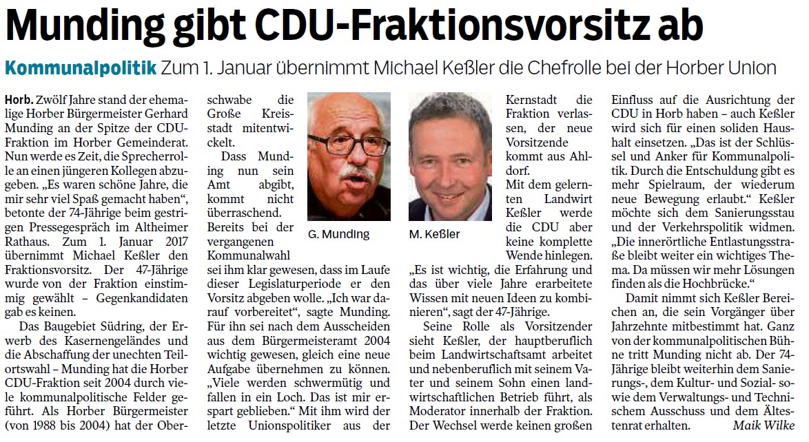 Michael Keßler neuer CDU-Fraktionschef - Gerhard Munding übergibt Amt zum 1. Januar 2017